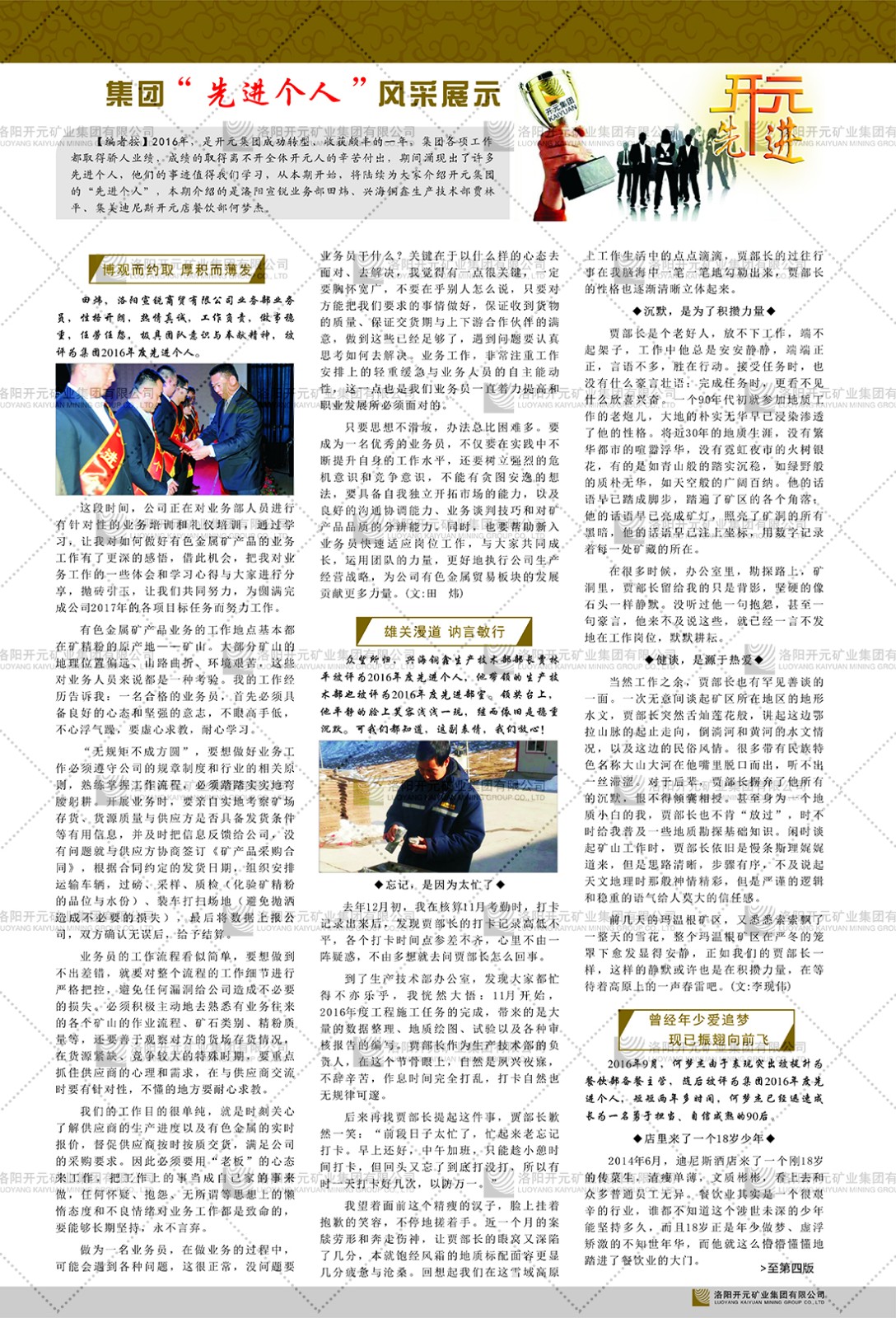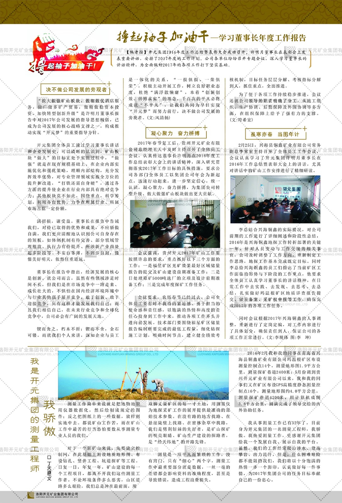 洛陽開元礦業(yè)集團(tuán)有限公司簡介洛陽開元礦業(yè)集團(tuán)有限公司,始成立于2006年,位于洛陽市開元大道269號。集團(tuán)旗下共有十余家全資子公司,業(yè)務(wù)涉及有色金屬礦山開發(fā)、礦產(chǎn)品購銷與進(jìn)出口貿(mào)易、房地產(chǎn)開發(fā)、文化藝術(shù)、企業(yè)管理與咨詢、資本投資等多個領(lǐng)域。2024年,集團(tuán)公司銷售總額達(dá)7.8億元。民建河南省委委員、民建河南省委企業(yè)委副主任、民建洛陽市委委員、企業(yè)委主任、洛陽民建企業(yè)家協(xié)會會長許明月是公司創(chuàng)始人,現(xiàn)任洛陽開元礦業(yè)集團(tuán)有限公司董事長。在礦業(yè)領(lǐng)域,洛陽開元礦業(yè)集團(tuán)擁有多家實(shí)力雄厚的子公司:貴州開元礦業(yè)有限公司探、采礦權(quán)面積共11.33平方公里;興海縣銅鑫礦業(yè)有限公司探礦權(quán)面積8.76平方公里,礦山資源潛力巨大;2021年,開元集團(tuán)與盧氏中科礦業(yè)有限公司開展戰(zhàn)略合作。盧氏中科礦業(yè)有限公司專注于有色金屬的浮選、加工和銷售,擁有強(qiáng)大的技術(shù)支撐平臺,是集探、采、選、冶、研為一體的中大型綜合礦業(yè)企業(yè)。目前,盧氏中科王家河1000噸選礦廠已成功投產(chǎn),雙河金礦、柳關(guān)欒盧鉛鋅礦相繼順利開工,樓房銀礦與圪老灣鉛鋅礦的深部探礦重大突破,標(biāo)志著礦山版圖取得重大進(jìn)展,為開元集團(tuán)后續(xù)發(fā)展奠定了堅(jiān)實(shí)基礎(chǔ)。在文化傳媒領(lǐng)域,洛陽市明月美術(shù)館通過豐富多樣的藝術(shù)展覽、學(xué)術(shù)研討和公共教育活動,努力打造一個集展覽、交流、教育、研究為一體的綜合性藝術(shù)平臺。此外,在金融投資領(lǐng)域,開元集團(tuán)旗下的北京明峰資本管理有限公司專注于投資具有高增長潛力的優(yōu)秀企業(yè),特別是高科技、新能源、環(huán)保等新興產(chǎn)業(yè),為客戶提供個性化的資產(chǎn)配置服務(wù)。在做好企業(yè)經(jīng)營的同時,開元集團(tuán)始終不忘企業(yè)的社會責(zé)任和家國情懷,以突出的愛心公益事跡,開展了一系列公益慈善活動:“民建林”公益事業(yè)通過“思源基金”“幫幫公益”線上公益平臺,與眾多愛心人士籌措資金20余萬元;資助541名貧困大學(xué)生共計(jì)270余萬元,推進(jìn)“數(shù)字助力——河南AI人才培養(yǎng)”;捐款10萬元,馳援京津冀、黑龍江洪水地質(zhì)災(zāi)害……公司于2017年底被洛陽市慈善總會評為“洛陽慈善風(fēng)云榜——十大愛心集體”。洛陽開元礦業(yè)集團(tuán)有限公司秉承持續(xù)發(fā)展理念,憑借多年來良好的企業(yè)信譽(yù)與經(jīng)營業(yè)績,與全國多家企業(yè)建立了良好合作關(guān)系,受到社會各界的一致好評,多次榮獲“納稅標(biāo)兵”“先進(jìn)企業(yè)”“招商引資模范企業(yè)”等榮譽(yù)稱號。回望來時路,開元人勠力同心,以“闖”的精神和“創(chuàng)”的勁頭,一路披荊斬棘,踏過千山萬水;展望新未來,開元人凝心聚力,不執(zhí)于“舊”,無畏于“新”,秉承“勇于跨越,追求卓越”的企業(yè)精神,乘著國家高質(zhì)量發(fā)展新征程的東風(fēng),跨過高山,越過大海,向著集團(tuán)多元化、國際化的目標(biāo),逐夢遠(yuǎn)航,跨越前行!