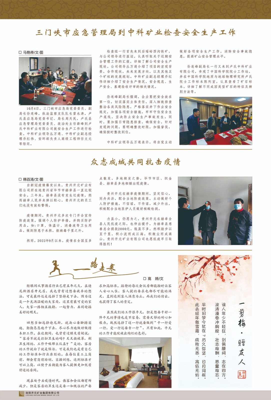 洛陽開元礦業(yè)集團(tuán)有限公司簡介洛陽開元礦業(yè)集團(tuán)有限公司,始成立于2006年,位于洛陽市開元大道269號(hào)。集團(tuán)旗下共有十余家全資子公司,業(yè)務(wù)涉及有色金屬礦山開發(fā)、礦產(chǎn)品購銷與進(jìn)出口貿(mào)易、房地產(chǎn)開發(fā)、文化藝術(shù)、企業(yè)管理與咨詢、資本投資等多個(gè)領(lǐng)域。2024年,集團(tuán)公司銷售總額達(dá)7.8億元。民建河南省委委員、民建河南省委企業(yè)委副主任、民建洛陽市委委員、企業(yè)委主任、洛陽民建企業(yè)家協(xié)會(huì)會(huì)長許明月是公司創(chuàng)始人,現(xiàn)任洛陽開元礦業(yè)集團(tuán)有限公司董事長。在礦業(yè)領(lǐng)域,洛陽開元礦業(yè)集團(tuán)擁有多家實(shí)力雄厚的子公司:貴州開元礦業(yè)有限公司探、采礦權(quán)面積共11.33平方公里;興海縣銅鑫礦業(yè)有限公司探礦權(quán)面積8.76平方公里,礦山資源潛力巨大;2021年,開元集團(tuán)與盧氏中科礦業(yè)有限公司開展戰(zhàn)略合作。盧氏中科礦業(yè)有限公司專注于有色金屬的浮選、加工和銷售,擁有強(qiáng)大的技術(shù)支撐平臺(tái),是集探、采、選、冶、研為一體的中大型綜合礦業(yè)企業(yè)。目前,盧氏中科王家河1000噸選礦廠已成功投產(chǎn),雙河金礦、柳關(guān)欒盧鉛鋅礦相繼順利開工,樓房銀礦與圪老灣鉛鋅礦的深部探礦重大突破,標(biāo)志著礦山版圖取得重大進(jìn)展,為開元集團(tuán)后續(xù)發(fā)展奠定了堅(jiān)實(shí)基礎(chǔ)。在文化傳媒領(lǐng)域,洛陽市明月美術(shù)館通過豐富多樣的藝術(shù)展覽、學(xué)術(shù)研討和公共教育活動(dòng),努力打造一個(gè)集展覽、交流、教育、研究為一體的綜合性藝術(shù)平臺(tái)。此外,在金融投資領(lǐng)域,開元集團(tuán)旗下的北京明峰資本管理有限公司專注于投資具有高增長潛力的優(yōu)秀企業(yè),特別是高科技、新能源、環(huán)保等新興產(chǎn)業(yè),為客戶提供個(gè)性化的資產(chǎn)配置服務(wù)。在做好企業(yè)經(jīng)營的同時(shí),開元集團(tuán)始終不忘企業(yè)的社會(huì)責(zé)任和家國情懷,以突出的愛心公益事跡,開展了一系列公益慈善活動(dòng):“民建林”公益事業(yè)通過“思源基金”“幫幫公益”線上公益平臺(tái),與眾多愛心人士籌措資金20余萬元;資助541名貧困大學(xué)生共計(jì)270余萬元,推進(jìn)“數(shù)字助力——河南AI人才培養(yǎng)”;捐款10萬元,馳援京津冀、黑龍江洪水地質(zhì)災(zāi)害……公司于2017年底被洛陽市慈善總會(huì)評為“洛陽慈善風(fēng)云榜——十大愛心集體”。洛陽開元礦業(yè)集團(tuán)有限公司秉承持續(xù)發(fā)展理念,憑借多年來良好的企業(yè)信譽(yù)與經(jīng)營業(yè)績,與全國多家企業(yè)建立了良好合作關(guān)系,受到社會(huì)各界的一致好評,多次榮獲“納稅標(biāo)兵”“先進(jìn)企業(yè)”“招商引資模范企業(yè)”等榮譽(yù)稱號(hào)。回望來時(shí)路,開元人勠力同心,以“闖”的精神和“創(chuàng)”的勁頭,一路披荊斬棘,踏過千山萬水;展望新未來,開元人凝心聚力,不執(zhí)于“舊”,無畏于“新”,秉承“勇于跨越,追求卓越”的企業(yè)精神,乘著國家高質(zhì)量發(fā)展新征程的東風(fēng),跨過高山,越過大海,向著集團(tuán)多元化、國際化的目標(biāo),逐夢遠(yuǎn)航,跨越前行!